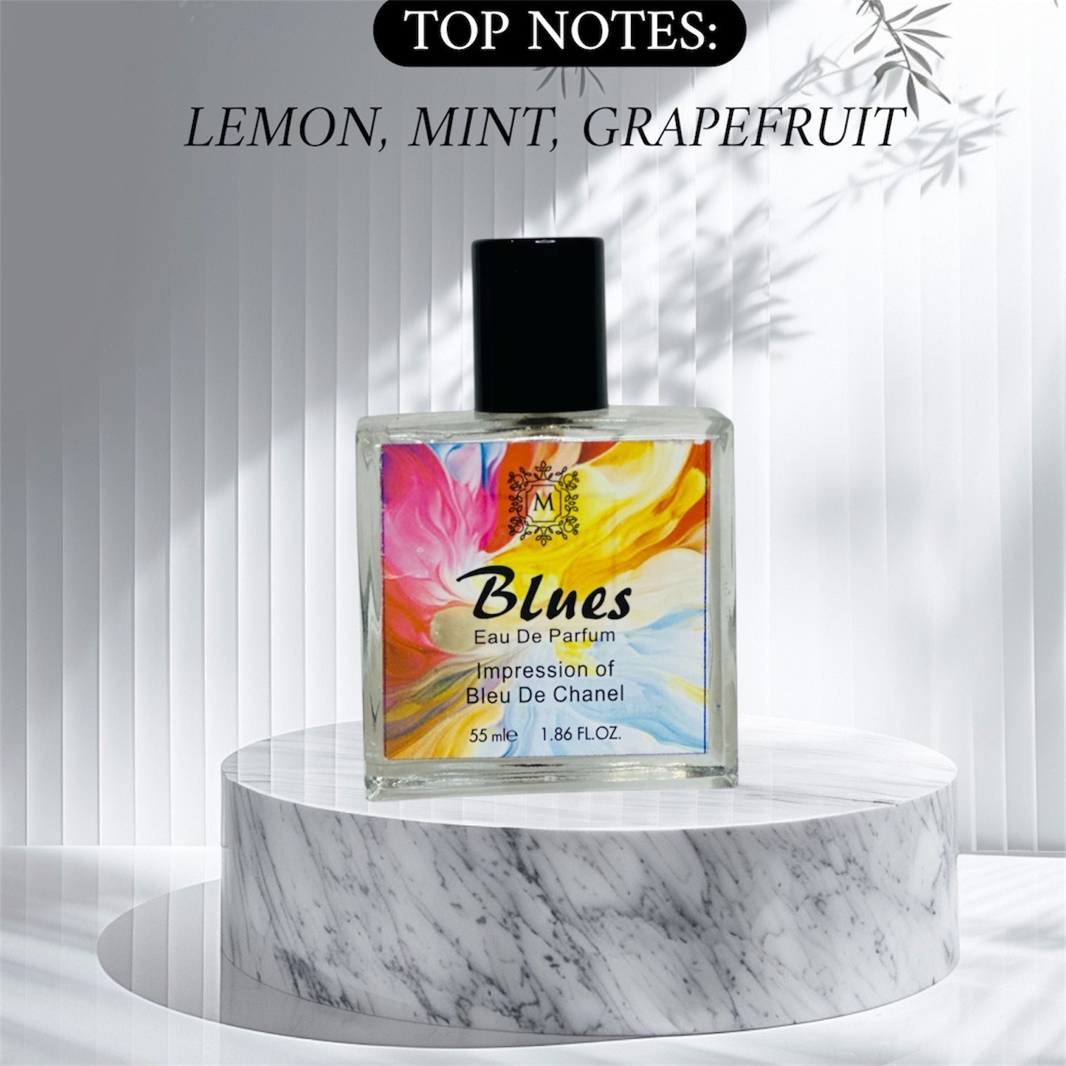 Blues by Malhaar Fragrance is described as a woody aromatic fragrance, which is identified by the combination of "aromatic herbs" and an "opulent center and base." The fragrance contains top notes of lemon, mint, pink pepper, and grapefruit; middle notes of ginger, Iso E Super, nutmeg, and jasmine; and base notes of labdanum.